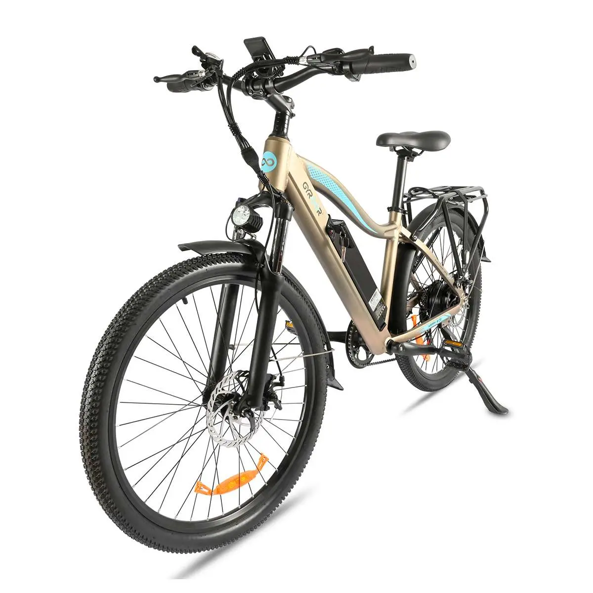 Descubrí una e-bike que fusiona potencia, estilo y autonomía con la Gyroor EB-041. De rodado 27,5″ para una conducción estable y confortable, esta bicicleta eléctrica incluye un motor de 500 W (48 V) y una batería de 48 V 10,4 Ah, proporcionando un rango estimado de 35 a 70 km según el nivel de asistencia al pedaleo. Cuenta con 5 niveles de asistencia, cambios Shimano de 7 velocidades, y frenos de disco para un manejo seguro. Su cuadro en aleación de aluminio le da ligereza, mientras que el llamativo color dorado aporta un toque premium. Además, integra panel LED para monitorear velocidad y batería, luces delantera y trasera, guardabarros, bocina y parrilla, lo que la convierte en una opción práctica para desplazamientos diarios o paseos recreativos.
